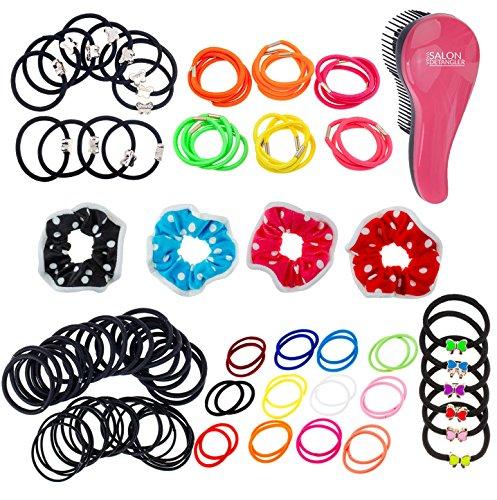 Set of Different Snag Free Hair Bands, Velvet Scrunchies and Glide Through Detangling Brush. In this set, along with pink detangling brush, you will find the following hairstyling essentials: 1. 12pcs black, snag free, elastic hair bands with silver butterflies decorations 2. 6pcs black, snag free, elastic hair bands with bowties in 6 different colors 3. 24pcs snag free, elastic hair bands in 6 different neon colors 4. 24pcs snag free, elastic hair bands in many different colors and 2.0" diameter 5. 36pcs black, snag free, elastic hair bands 6. velvet scrunchy in red with white polka dots 7. velvet scrunchy in black with white polka dots 8. velvet scrunchy in pink with white polka dots 9. velvet scrunchy in blue with white polka dots. Diameter of elastic hair bands, when not stretched, is 1.6" and of the ones with bowties is 2.2". Inner diameter of scrunchies is 1.2". Please note that colors may slightly vary from the image.