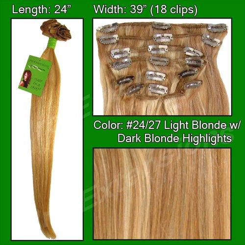 This Pro Extensions clip in hair extension set is Colored #24/27, Light Blonde w/ Dark Blonde Highlights. Pro Extensions are 100% human hair extensions. This set of hair extensions is 24" long and 39" wide. This hair extensions set is Grade A+ Remi, Color #24/27, Light Blonde w/Dark Blonde Highlights. Remi hair extensions is considered the world's finest grade of human hair extensions. Also, Remi hair is painstakingly ensured that every piece of hair within the set is directionally the same from root to tip. The set weight is 110 grams. Pro Extensions can add length, volume or texture to your current hair style. The extensions can be styled effortlessly as easy as your own human hair and will blend seamlessly into your own hair style. The individual weft breakdown within the set is: one (1) 8 inch wide weft with 3 clips, one (1) 7 inch wide weft with 3 clips each, two (2) 6 inch wide wefts with 3 clips each, and six (6) 1 and 1/2 inch wide wefts with 1 clip each, and two (2) 1 and 1/2 inch wide wefts (no clips) for testing/coloring. Each weft has ample clips to ensure a snug hold. Our clips have a polymer coating to ensure no damage to your hair or discomfort to your scalp.Pro-Extensions is the leading provider of premium clip-in human hair extensions in the United States. At last, women can have the hair styles of super stars and super models without spending endless hours of time at high priced hair specialists. Whether you need to add fullness to fine hair, add length to short hair, or to simply add highlights without using chemicals, Pro Extensions is your solution.Brybelly.com is the exclusive drop shipper of this product.